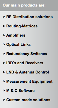Their product range offers various RF-distribution products like splitters/combiners, switches, redundancy switches, routing-matrices, amplifiers, spectrum-analyzers, RF-over-Fiber systems as well as tailor-made solutions especially designed for individual needs. Click on the graphic to see their website.