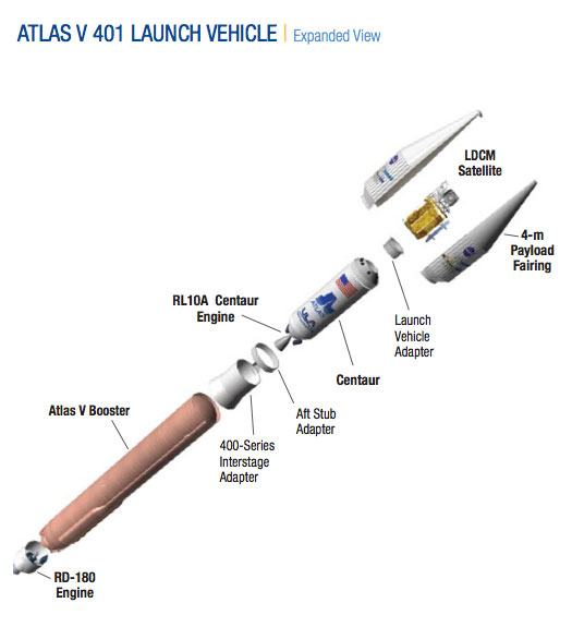 The Atlas V 401 consists of a single Atlas V booster stage, the Centaur upper stage, and a 4-m diameter payload fairing (PLF). The Atlas V booster is 12.5 ft in diameter and 106.5 ft in length. The booster’s tanks are structurally rigid and constructed of isogrid aluminum barrels, spun-formed aluminum domes, and intertank skirts. Atlas booster propulsion is provided by the RD-180 engine system (a single engine with two thrust chambers). The RD-180 burns RP-1 (Rocket Propellant-1 or highly purified kerosene) and liquid oxygen, and delivers 860,200 lb of thrust at sea level. The Atlas V booster is controlled by the Centaur avionics system, which provides guidance, flight control, and vehicle sequencing functions during the booster and Centaur phases of flight.