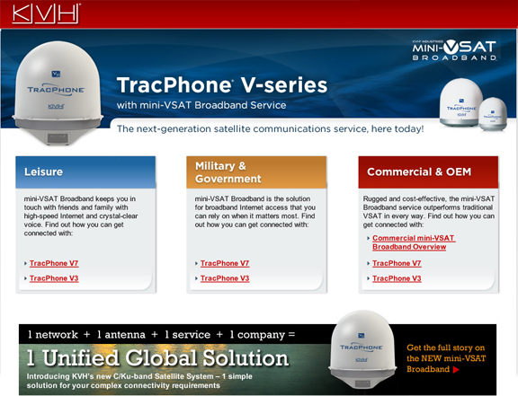 KVH is the only maritime VSAT provider to manufacture its own fully integrated onboard terminal and network manager, operate a global C/Ku-band VSAT network, and provide worldwide 24/7/365 after-sale support. The ability to control every aspect of its equipment and network has enabled KVH to field the world’s premier global maritime VSAT network. In March 2012, the marketing research firm Euroconsult reported KVH leads the maritime VSAT market for number of customers using its service.