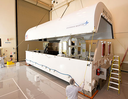 In Sunnyvale, Calif., Lockheed Martin engineers prepare the first geosynchronous (GEO-1) Space Based Infrared System (SBIRS) spacecraft for shipment to Cape Canaveral Air Force Station, Florida. Photo courtesy of Lockheed Martin.