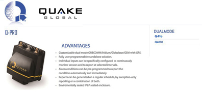 Quake Global, Inc., a manufacturer of asset tracking satellite M2M modems, has now made available their Q-Pro Satellite Data Modem for use on the Inmarsat network. The service will enable QUAKE™ to offer its customers low-cost satellite tracking and data services globally over the Inmarsat-4 satellite constellation. QUAKE is already a leading supplier of satellite modems for the worldwide tracking and data service market, and the addition of Inmarsat’s global satellite coverage will greatly enhance QUAKE’s ability to improve market share.