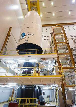The integration process' next step will occur when SES-2 is positioned on the launcher's core section as the lower payload, allowing the "stack" to be completed with installation of the Arabsat-5C/SYLDA/fairing combination atop it. During the flight sequence, the payload fairing will be jettisoned first, followed by deployment of Arabsat-5C. The SYLDA dispenser is then released, allowing the subsequent separation of SES-2 to complete the Arianespace mission.