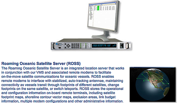 The ROAM protocol offers a common management interface for Comtech EF Data's Roaming Oceanic Satellite Server (ROSS) and third-party Antenna Control Units (ACUs) by providing a generic set of commands, information, interfaces and status queries. ROSS is an integrated location server that works in conjunction with Comtech EF Data's Vipersat Management System to facilitate on-the-move satellite communications for oceanic vessels. ROSS enables remote modems to interface with stabilized, auto-tracking antennae, maintaining connectivity as vessels move through footprints of different satellites. Vessel position data, satellite signal and management status are constantly monitored to determine when satellite handoff is necessary.