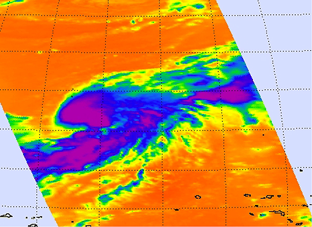 Tropical Storm Sonca's maximum sustained winds are near 35 knots (40 mph) so it's just over the threshold of being a tropical storm. The storm is over 120 miles in diameter with tropical storm-force wind gusts out 60 miles from the center. Sonca is approximately 760 nautical miles east of the island of Iwo To, Japan, and has tracked north-northwestward at 9 knots (10 mph). Forecasters at the Joint Typhoon Warning Center are monitoring the progress of Sonca and using the infrared data that AIRS provides in addition data from other NASA satellites. Sonca is currently forecast to pass to the northeast of Chichi Jima, Japan over the weekend and bring gusty winds, heavy surf and rainfall to the island.