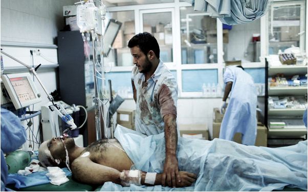 A man stood over a relative who had been shot by a pro-Qaddafi sniper in Tripoli on Thursday. Photo by Moises Saman for The New York Times