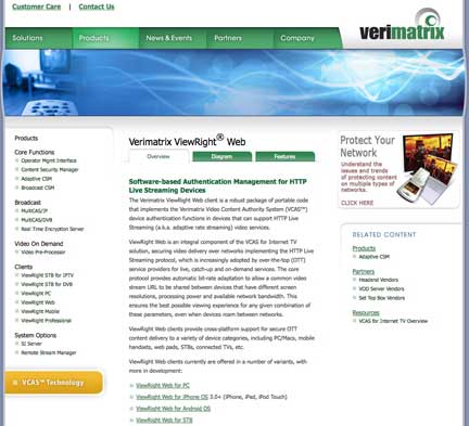 This is a robust package of portable security applications that provide authentication services for the growing range of devices supporting the HTTP Live Streaming video standard. As an integral component of the Verimatrix Video Content Authority System (VCAS™) for Internet TV solution, ViewRight Web technology is designed for operators that want to deploy secure over-the-top (OTT) video content services using this advanced adaptive rate streaming protocol. Using a security single client, this new breed of video service can offer a seamless mix of live, catch-up and on-demand content.