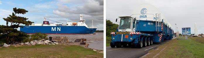 The MN Colibri arrives in French Guiana with the latest Ariane 5 for delivery to the Spaceport (photo at left). In the photo at right, the Ariane 5’s core cryogenic stage is driven into the Spaceport’s main base area.