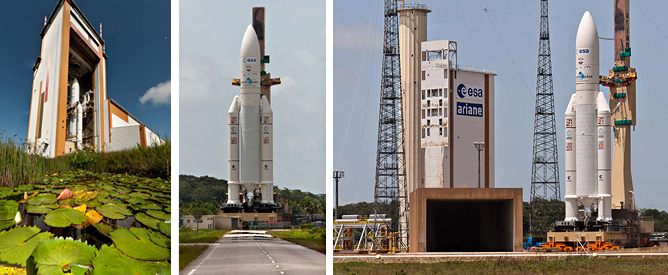 Today’s transfer of the Ariane 5 is illustrated in this photo series. At left, the launcher is ready to roll out from the Spaceport’s Final Assembly Building, in which it was fitted with the ATV Albert Einstein. The middle image shows Ariane 5 en route to the ELA-3 launch zone, where (at right) it nears the lock-down position among the flame ducts and fixed umbilical tower.