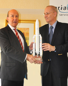 Adrian Ballantine, left, and Jean-Yves Le Gall, right, at the signing of the new launch contract.