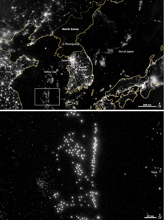 The top, wide-area image shows the Korean Peninsula, parts of China and Japan, the Yellow Sea, and the Sea of Japan (also known as the East Sea). The white inset box shows the lights of fishing boats in the Yellow Sea, and many of the boats appear to form a line, as if marking a watery boundary between nations.