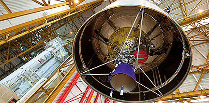 This “action” photo shows the Ariane 5’s upper composite, consisting of the Ariane 5’s ESC-A cryogenic upper stage and vehicle equipment bay, as it is hoisted for installation on the assembled launcher – visible at left in the Spaceport’s integration building. Photo courtesy of Arianespace.