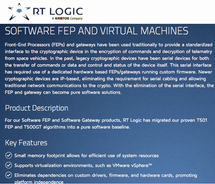 RT Logic's Software FEP and Software Gateway support virtual machine environments, and their small memory footprint allows for more efficient use of system resources. In addition, they achieve platform independence by eliminating custom drivers, firmware and hardware cards. Both products are scalable and support blade-server architectures, enabling them to match the expanding requirements of satellite constellations as they grow over time.