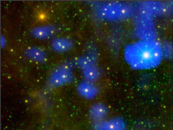 In this image, infrared data from WISE and a past all-sky survey mission, the Infrared Astronomical Satellite (IRAS), have been combined. Color is used to show similar observations taken almost thirty years apart; the recent WISE data are color-coded green and red, while the older IRAS data are blue.