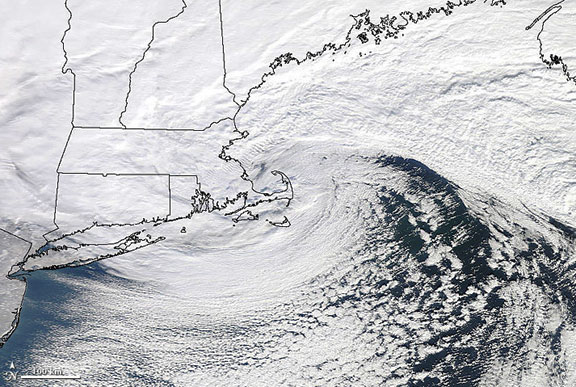 The storm began developing late on January 11, as a snow-making system that had hit the southern U.S. rode up the Atlantic seaboard and merged with another system crossing from the Midwest. The Moderate Resolution Imaging Spectroradiometer (MODIS) on NASA’s Terra satellite took this photo-like image at 10 a.m. Eastern Standard Time on January 12, when the storm was centered over southern New England. The storm had a distinctive comma shape—reminiscent of a hurricane—that forms when air circles around a low-pressure center (centered over Cape Cod, Massachusetts, in the image). Higher, thinner clouds swept around the south side of the storm, circling counterclockwise around the center. These lines of clouds formed when frigid winds blowing off the land chilled the moist ocean air.