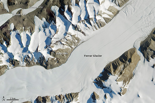 A small part of Taylor Glacier is visible in the upper left of the image. Where the edge of Taylor Glacier meets Lake Bonney, there is a unique feature known as “Blood Falls.” Discovered in 1911 by a member of Robert Scott’s doomed expedition to the South Pole, the name refers to a rusty stain of red that coats part of the glacier and spills down toward Lake Bonney in a pattern that makes it look like a frozen, blood-red waterfall.