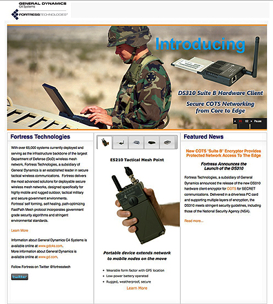 The DS310 is a hardware device that uses well-established, public domain cryptographic Suite B algorithms specified by the NSA, providing sufficient encryption for U.S. agencies and its allies to connect to classified networks. This commercial off-the-shelf, competitively priced product expands General Dynamics' initiative to deliver secure communications from the core to the very edge of the network. During last week's LandWarNet 2011, General Dynamics showcased the DS310 operating with a General Dynamics Itronix rugged computer platform. Leveraging the FastPath Mesh™ self-forming, self-healing, path-optimizing meshing protocol, Fortress' products incorporate the highest level of security algorithms and meet stringent environmental standards for use in austere environments.