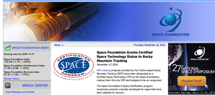[SatNews] GPS tracking products provided by Fort Collins, CO, -based Rocky Mountain Tracking (RMT) have been designated as a Certified Space Technology(tm) by the Space Foundation, making them the only GPS technologies to be so recognized.