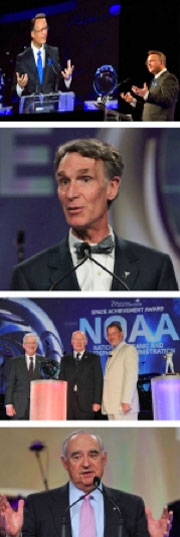 The Space Achievement Award to the National Oceanic and Atmospheric Administration (NOAA) for its use of space-based systems in making life-saving predictions and issuing early warnings of calamitous weather conditions (Director of NOAA’s Earth System Research Laboratory and Deputy Assistant Administrator for Research Laboratories and Cooperative Institutes Dr. Alexander (Sandy) MacDonald, pictured right center, with Space Foundation Board Chairman Marty Faga, left, and Pulham, right).