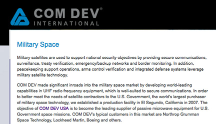 [SatNews] COM DEV International Ltd. (TSX:CDV), ("COM DEV" or "the Company") has completed delivery of a fourth flight set of hardware for the U.S. Air Force's Advanced Extremely High Frequency (AEHF) protected military satellite communications program.