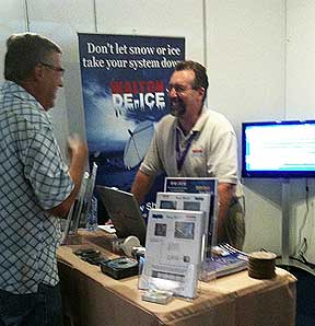 [SatNews] Walton Enterprises Inc. (Also known as Walton De-ice) designs and manufactures an extensive line of equipment available for preventing the accumulation of snow and/or ice on satellite Earth station antennas. Shown here is vice president David Walton at his booth located in Hall 1 F49. The original Walton De-ice product includes a behind the antenna main reflector plenum (enclosure) which is heated with hot air.