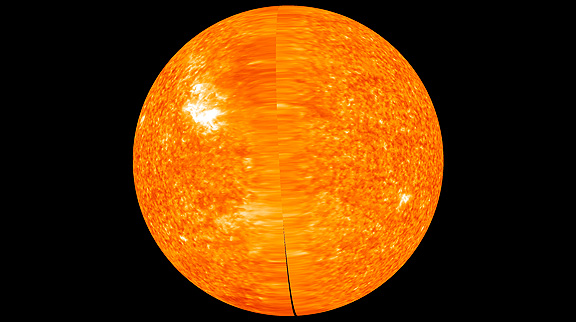 On February 6, 2011, the twin satellites reached opposite sides of the Sun, allowing space weather watchers to detect activity at any point on the sphere and to image eruptions that might be headed toward Earth. “For the first time ever, we can watch solar activity in its full 3-dimensional glory,” said Angelos Vourlidas, a member of the STEREO science team from the U.S. Naval Research Laboratory. This composite image of the far side of the Sun was acquired at 18:16 Universal Time (Greenwich Time) on February 14, 2011. The left side of the disk was captured by STEREO A (ahead) and the right side by STEREO B (behind). Because of the geometry of the orbits of the spacecraft—which are slightly inclined above and below the plane of the planets, or the ecliptic—there are minor gaps in the data near the poles.
