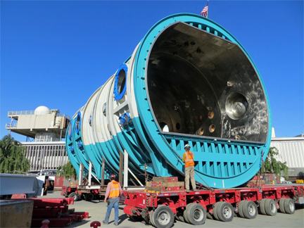 The shell for a new thermal vacuum chamber is shown here as it is moved into place at the SSL satellite manufacturing facility in Palo Alto, California.