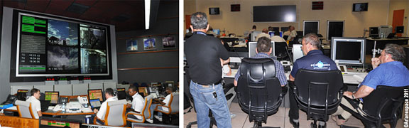The “dry run” simulated flight of Soyuz was a highly realistic exercise that included operational staffing of the Spaceport’s Jupiter mission control room (at left) and the Soyuz launch center (at right).