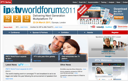 More than 6,000 attendees and over 150 exhibitors are expected to attend the three day show to discuss the progression of connected TV and the increased adoption and application of IP. To view the full event program and register for the conference, visit the IP&TV World Forum 2011 website at www.iptv.com.