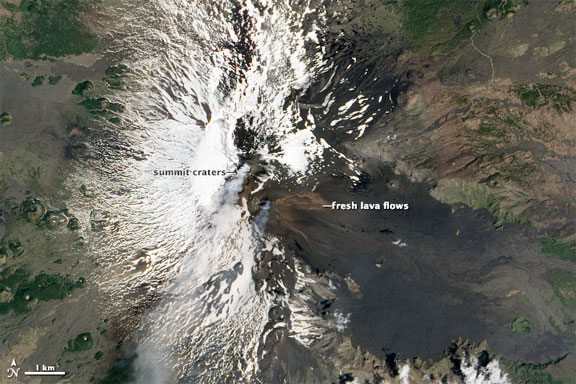 ...activity on Mount Etna in Sicily. Ash and volcanic gases rose from craters near the summit; snow rested on the western slopes; and fresh lava flows leant a dark brown hue to the mountainside near the New Southeast Crater.