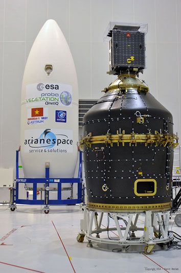 The payload stack begins with Vietnam’s 120-kg. VNREDSat-1 and the 1.3-kg. ESTCube-1 Estonian student nanosatellite, which are positioned inside a dispenser container system called Vespa. Installed atop the Vespa dispenser is Proba-V, a 160-kg. spacecraft for the European Space Agency (ESA).