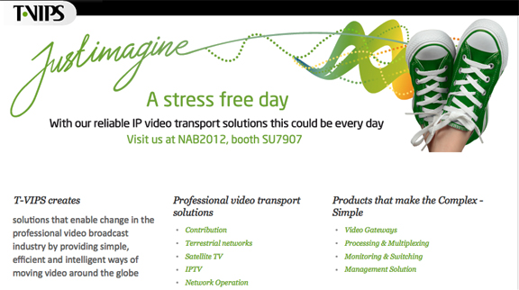 T-VIPS will also show its JPEG2000 and MPEG4 Video Gateways designed for live contribution. The recently introduced TVG650, an MPEG-4 Contribution Encoder, and the TVG610, an MPEG-4 Contribution Decoder, are part of T-VIPS’ Video Gateway line of products. They handle the encoding and decoding of MPEG-4, 4:2:2, 10-bit video, and support output on ASI and IP/Ethernet. A key element of the NAB demonstrations will be T-VIPS’ Connect management system, which provides an intuitive, web-based solution for the set-up and monitoring of equipment and connections in broadcasting, contribution and IP video transport networks.