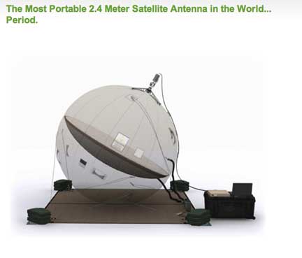 The GATR offers portability and supplies the same communication capability as heavier (less portable) 2.4m rigid dish systems, but can pack into two airline-checkable cases. The GATR is lighter and has a smaller packed form-factor than any portable, rigid, large aperture system. In addition, the GATR is quick and easy to set up (two people, no special tools, on satellite in about 30 minutes).