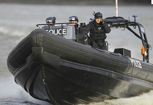 British police speed in a Rigid Inflatable Boat (RIB) along the river Thames ... courtesy of sinodefenceforum.com