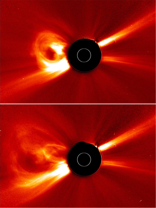 The strongest solar storms have the potential to interfere with communications, power grids, and satellites. Solar storms happen most frequently when the Sun is in the active phase of its 11-year cycle, called solar maximum. Though the Sun was expected to be entering solar maximum in 2010, it had been unusually quiet for at least two years. Despite its relative lack of activity, the Sun released a series of four coronal mass ejections between May 22 and May 24, 2010. These images show one coronal mass ejection on May 23. Both images were taken by the Solar Terrestrial Relations Observations (STEREO) Ahead spacecraft. The top image is from 20:09:15 Universal Time (UT). STEREO Ahead acquired the lower image just over two hours later at 22:24:00 UT. In the top image, a bright mass of charged particles loops from the Sun’s atmosphere. Two hours later, the looped mass had expanded and was moving away from the Sun. The images show only the Sun’s corona, the outermost layer of the atmosphere. A dark disk covers the rest of the Sun, and a white circle represents the Sun’s surface. When the charged particles from May’s coronal mass ejections reached Earth, they caused no damage, but they did generate sheets of colored light dancing across polar skies.