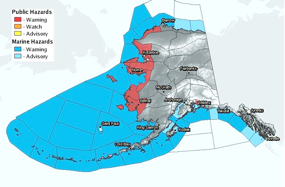 Warnings and forecasts for Western and Northwest Alaska can be found here. Warnings and forecasts for the Aleutian & Pribilof Islands here, and Southwest Alaska can be found here. An additional resource for total water level estimations for some western Alaska communities can be found here.