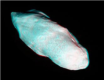Saturn's potato-shaped moon Prometheus is rendered in three dimensions in this close-up from Cassini. This 3D view is a color composite picture made from two different black and white images that were taken from slightly different viewing angles.