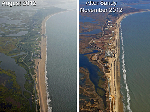 ...along the East Coast, it brought damage to NASA's Wallops Flight Facility in Wallops Island, Virgina. The Wallops Shoreline Protection Project has been managing the restoration efforts and released before and after photos of the shoreline. At 8:00 a.m. EDT, on October 29, 2012, the National Hurricane Center reported tropical-storm-force winds were occurring along the coasts of southern New Jersey, Delaware and eastern Virginia. Tropical-storm-force winds extended as far inland as the central and southern Chesapeake Bay as Hurricane Sandy closed in for landfall. Hurricane Sandy removed about 700 feet of protective berm and about 20 percent of the beach protecting Wallops Island, home to NASA Wallops' launch pads and launch support facilities. The beach, which had been recently improved under the Wallops Island Shoreline Protection Project is vital to protecting the more than $1 billion in NASA and governmental assets on Wallops Island from hazards such as hurricanes and nor'easters. In addition to beach erosion, Hurricane Sandy caused minor roof, door and siding damage and downed trees throughout the facility.