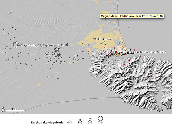 The USGS characterized the 6.3-magnitude quake on February 22 as an aftershock of the quake that struck to the west, in Darfield, New Zealand, on September 3, 2010. Darfield lies about 50 kilometers (30 miles) west-northwest of Christchurch. Although no specific tectonic structure linked the two events, numerous aftershocks of the September quake occurred along a roughly east-west line, as this image indicates. The USGS stated that the quakes were associated with regional tectonic plate boundary deformation. The Pacific Plate and the Australia Plate interact under the South Island of New Zealand. The Darfield earthquake in September 2010 caused no casualties, even though it had a higher magnitude. Besides striking closer to a major population center, the 6.3-magnitude Christchurch earthquake had a depth of just 5 kilometers (3 miles). The New Zealand Herald reported that, whereas the Darfield quake happened in the early morning hours, the February 22 quake struck at the “worst possible time” of day—at the lunch hour when city streets were crowded with shoppers, diners, office workers, and school children. Moreover, some of the buildings that collapsed may have been weakened by the September 2010 quake.
