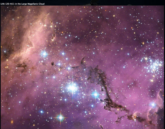 The Large Magellanic Cloud (LMC) is ablaze with star-forming regions. From the Tarantula Nebula, the brightest stellar nursery in our cosmic neighbourhood, to LHA 120-N 11, part of which is featured in this Hubble image, the small and irregular galaxy is scattered with glowing nebulae, the most noticeable sign that new stars are being born.