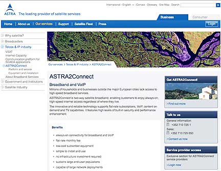 With more than 60,000 customers, ASTRA2Connect is the largest satellite-based broadband network in Europe. Offering always-on and interactive broadband internet access for flat service fees, ASTRA2Connect is immediately available anywhere within the footprint of the satellite. ASTRA2Connect is marketed via wholesalers and internet service providers to the residential, industrial and maritime markets.