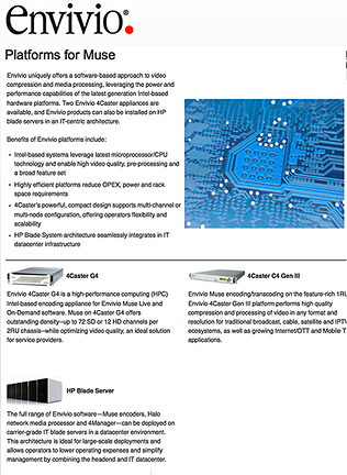 ...service provider in Mexico, has deployed Envivio Muse™ encoders for its live and on-demand video services. Totalplay is a subsidiary of Grupo Salinas, a leading media and financial services company in Mexico. Totalplay wanted to extend their channel lineup and improve video quality, while reducing the space requirements in the headend. The software-based Muse encoders on the Envivio 4Caster™ Gen III platform offered a flexible solution with outstanding quality, density and reliability.