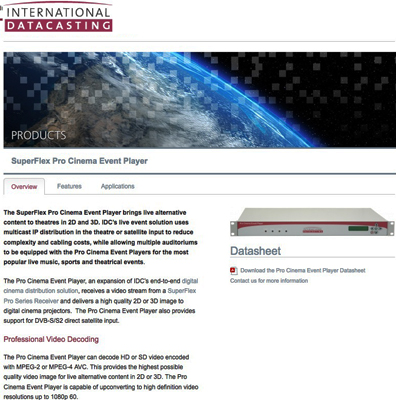 The Pro Cinema Event Player includes integrated SENSIO® Hi-Fi 3D technology. IDC is also introducing its digital cinema asset management platforms at IBC 2011. IDC's Distribution Manager has been developed to enable ingest, scheduling, and distribution of Digital Cinema Packages (DCPs) via satellite. The NOC Manager provides content management of DCPs on remote theatre Superflex receivers, including alarm notifications and reporting. International Datacasting is working with premiere customers including Deluxe/Echostar, Arqiva and Eutelsat in digital cinema content distribution worldwide, with more than 3,000 units shipped to date.