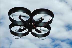 CyberQuad, a small unmanned aerial vehicle (UAV) from Cyber Technology. The CyberQuad is an electric, remote-controlled reconnaissance platform that features four ducted rotors to provide lift and maneuverability, allowing the remote-control UAV to be used in urban and enclosed environments. The four rotors give the CyberQuad the payload capacity and stability of a helicopter-type UAV, while the ducted design avoids the dangers associated with exposed propellers.