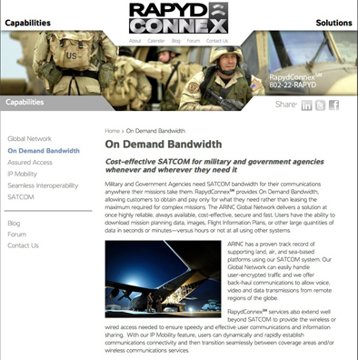 ARINC Engineering Services, LLC, has introduced RapydConnex(sm), a global communications network for military and commercial Mobile Edge Users who are unable to obtain the bandwidth, connectivity, or capabilities they need for mission success from their standard sources. RapydConnex brings a unique combination of capabilities to the mobile communications market, including the significant advantage of bandwidth-on-demand. The RapydConnex solution is supported by ARINC’s experienced workforce of government and commercial engineers, who can meet all types of customer requirements including aviation integration for airborne components as needed. integration of “best of class” products, to provide the highest performance at the lowest possible life cycle cost.