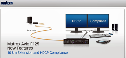Matrox Avio F125 — KVM Extender: Matrox Avio™ KVM extenders provide broadcast and post production facilities with the critical system performance required for their remote computing applications. A transmitter/receiver pair extends two uncompressed HD or one uncompressed 4K or 4K Ultra HD video, keyboard, mouse, USB 2.0 and stereo analog audio from the host system up to 6.2 mi (10 km) via a duplex LC-LC fiber optic cable. Creative professionals benefit from fast graphics and smooth HD and 4K Ultra HD video — without frame drops, color degradation or added latency — while high-end editing/rendering computers remain centralized in a secured machine room.