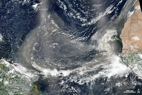 Dust from the Sahara Desert and other points in interior Africa were lofted into the sky in late July 2013, and the images above show the general westerly and northwesterly progression of the airborne particles across the Atlantic Ocean. (Note that the milky lines running vertically across each image are caused by sunglint, the reflection of sunlight off the ocean directly back at the sensor.) The images help reveal wind patterns (such as trade winds) that steer plumes and clouds. At several points, dust stretched continuously from North Africa to South America.