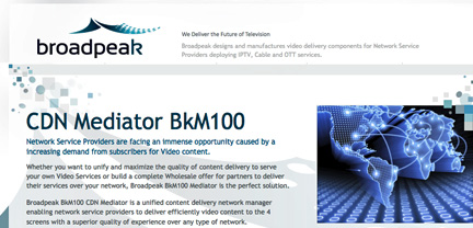 [SatNews] Broadpeak has announced that Singapore-based communications provider StarHub has deployed Broadpeak's BkM100 Mediator CDN manager and BkS300 multiformat video streaming servers to power its live video services. Broadpeak is also demonstrating a variety of CDN solutions, including their BkM100 Mediator and BkS300, at stand BK3-01.