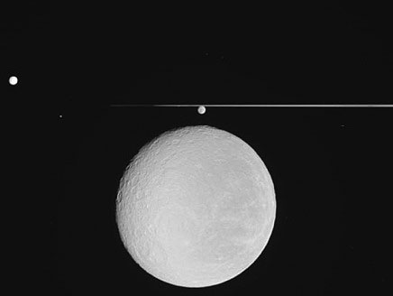 NASA's Cassini spacecraft captured this image showing Saturn's icy moon Rhea taking center stage, with cameo appearances by Saturn's rings and three clearly visible moons. Image credit: NASA/JPL/SSI