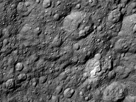 In this image obtained by NASA's Cassini spacecraft on its closest flyby of Saturn's moon Rhea, the heavily cratered surface of the moon appears in great detail. Just to the bottom right of the center of this image, a bright area appears to indicate a freshly excavated double crater. Image credit: NASA/JPL/SSI