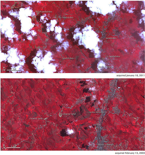 In this near-infrared image, vegetation-covered land appears red, concrete and building materials appear gray, clouds are white, and bare land tends to be sandy brown (though some exposed rock surfaces appear much darker). A comparison of the 2011 and 2003 images, combined with news and scientific accounts, reveals the likely tracks of light-brown mudslides marked in the image above. On January 12, roughly a month’s worth of rain—26 centimeters (10 inches)—fell in less than 24 hours in several parts of the Serra do Mar mountains. The town of Nova Friburgo, at the bottom right edge of this image, lost at least 389 people in the ensuing mudslides and flash floods, while nearby Teresopolis lost 324. More than 400 people are missing, and tens of thousands have either lost or suffered damage to their homes. The flood waters have since rushed south toward the cities of Sao Paolo and Rio de Janeiro. According to Reuters and based on United Nations data, the event is the second-worst loss of human life in Brazil’s history, behind a 1974 meningitis outbreak that killed 1,500 people.